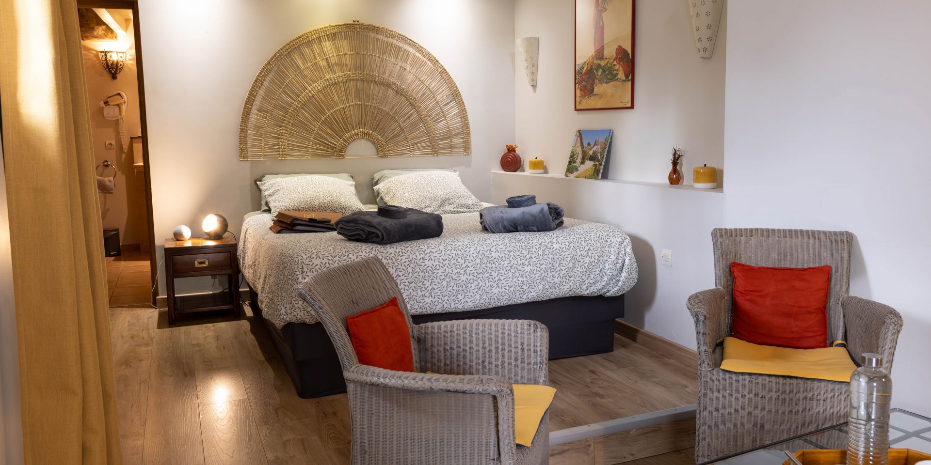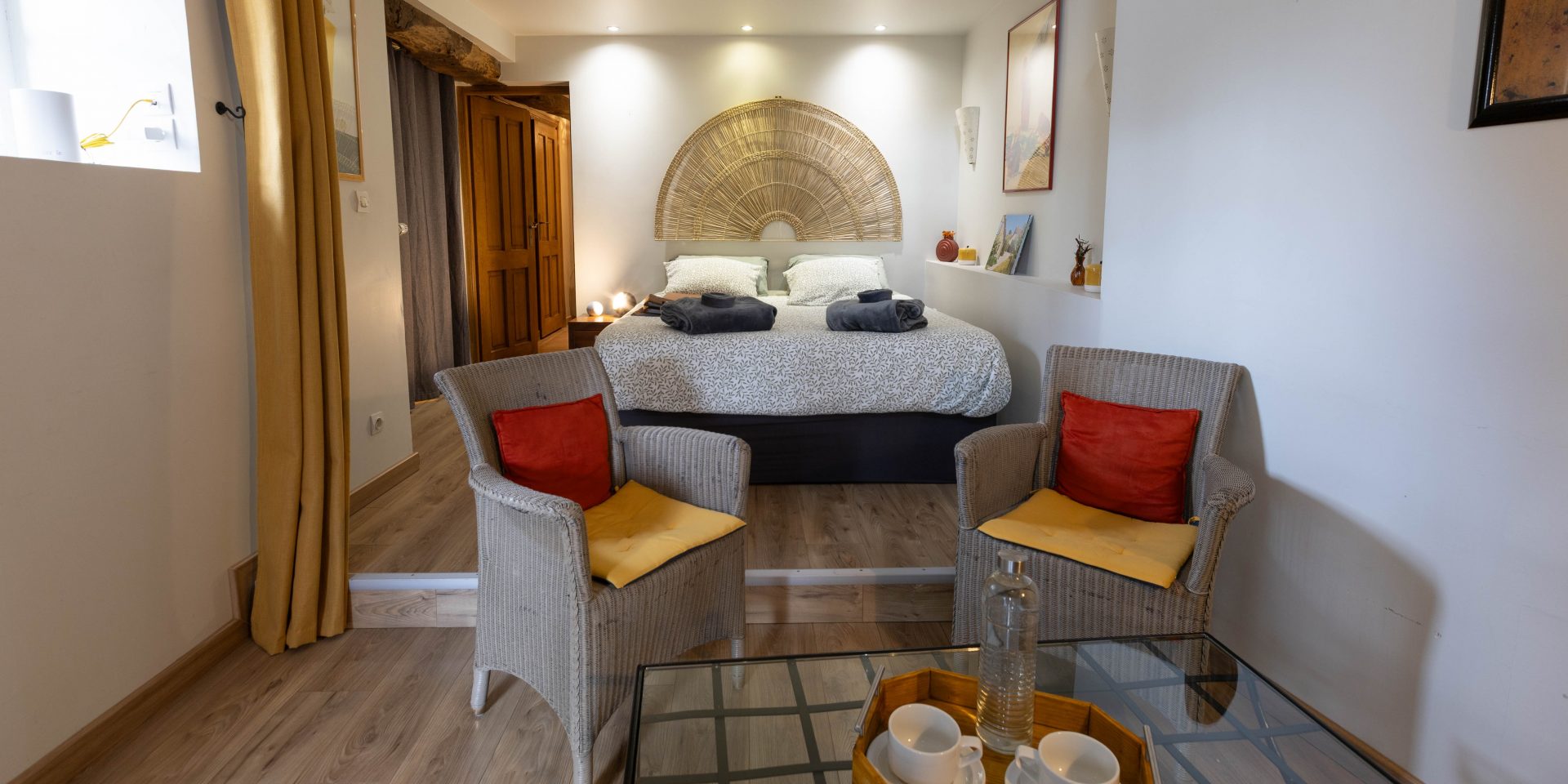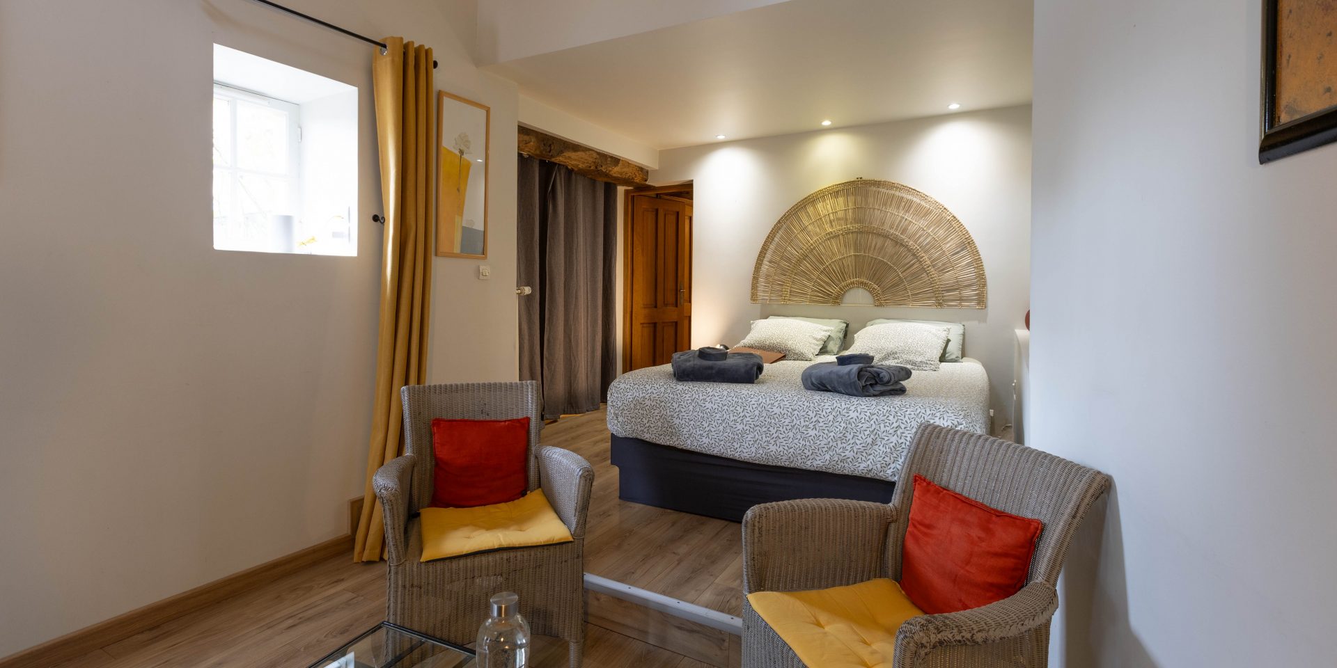 Située dans le corps de Ferme principal est première chambre à voir le jour à la Ferme de L’Oudon. La Romane d’une surface de 25m2 pour 2 personnes, de par son architecture allie poutres et pierres anciennes dans la plus pure tradition de la Ferme Normande.