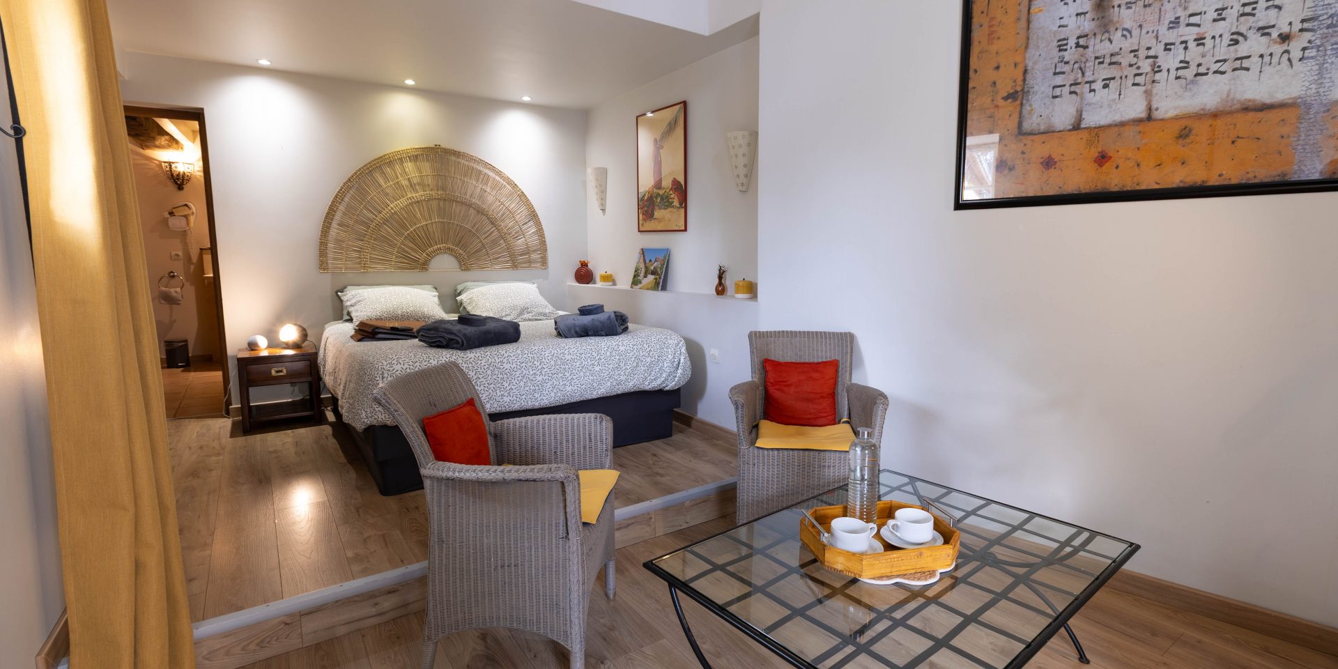 Dans la chambre : Mini Bar, réfrigérateur, micro-ondes, bouilloire et machine à expresso.