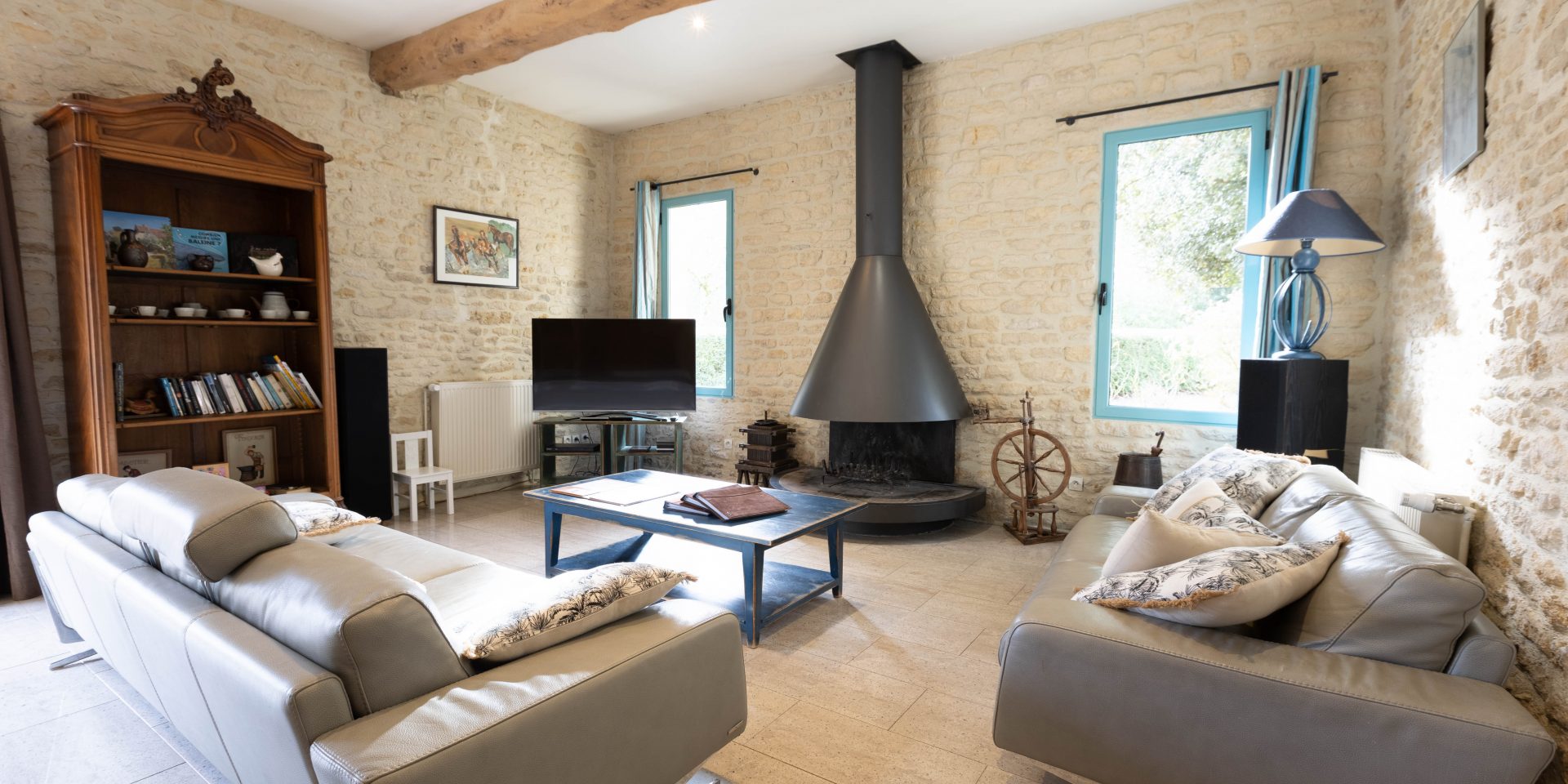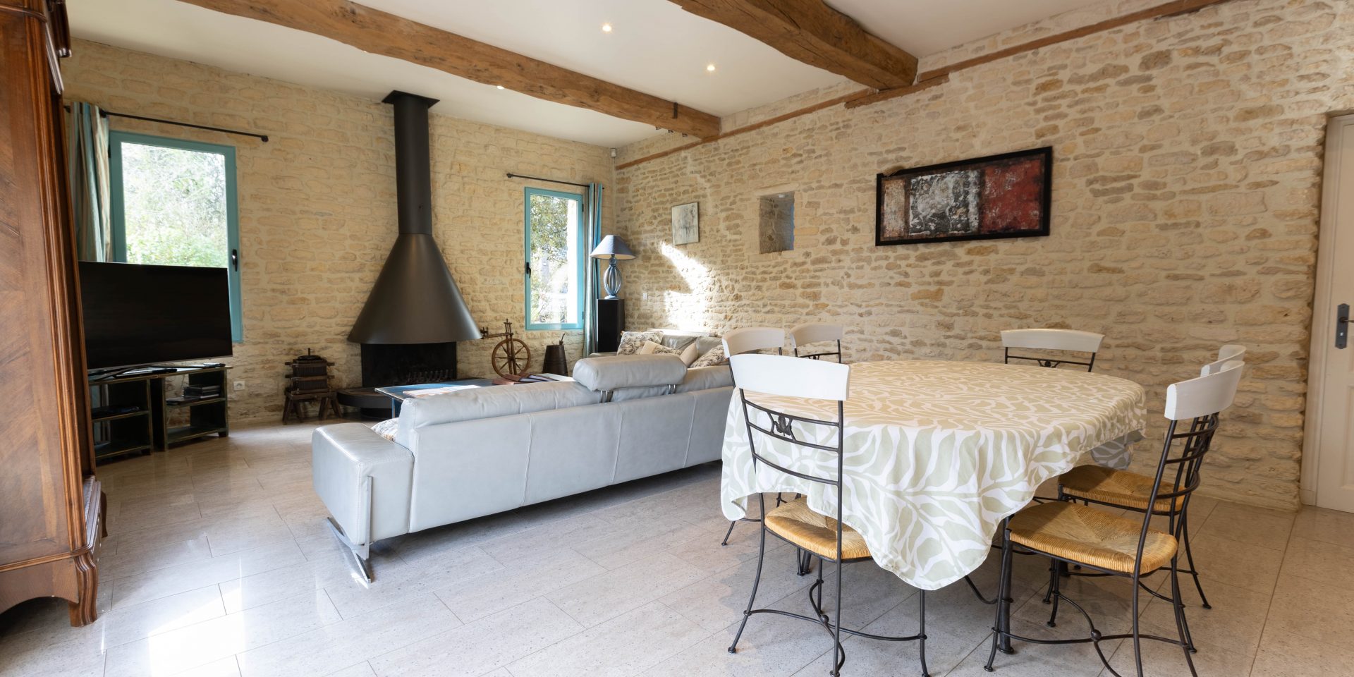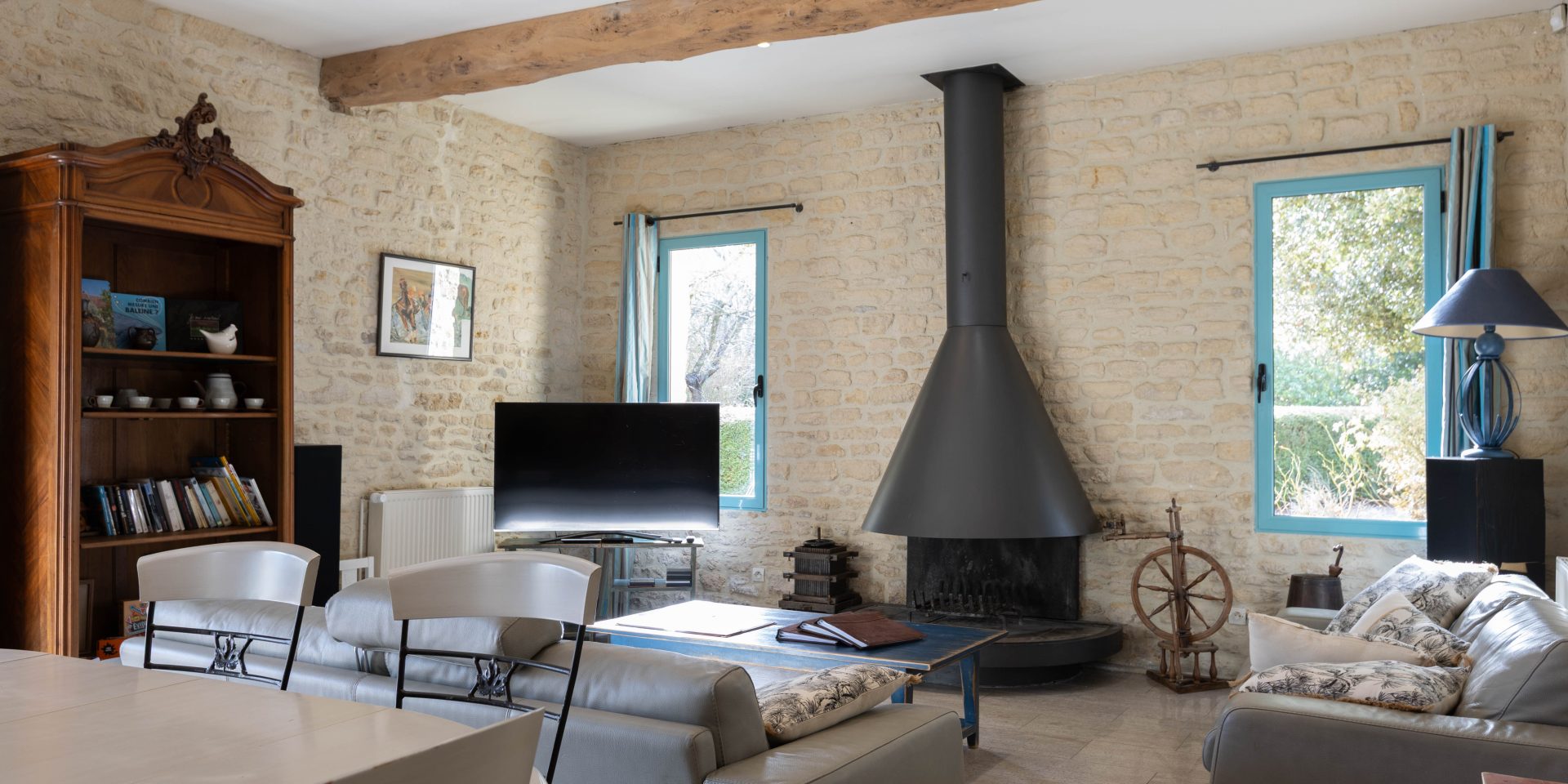 – Grande salle manger, salon avec cheminée et Smart TV 140 cm. La cheminée du salon est fonctionnelle de la Toussaint à Pâques.