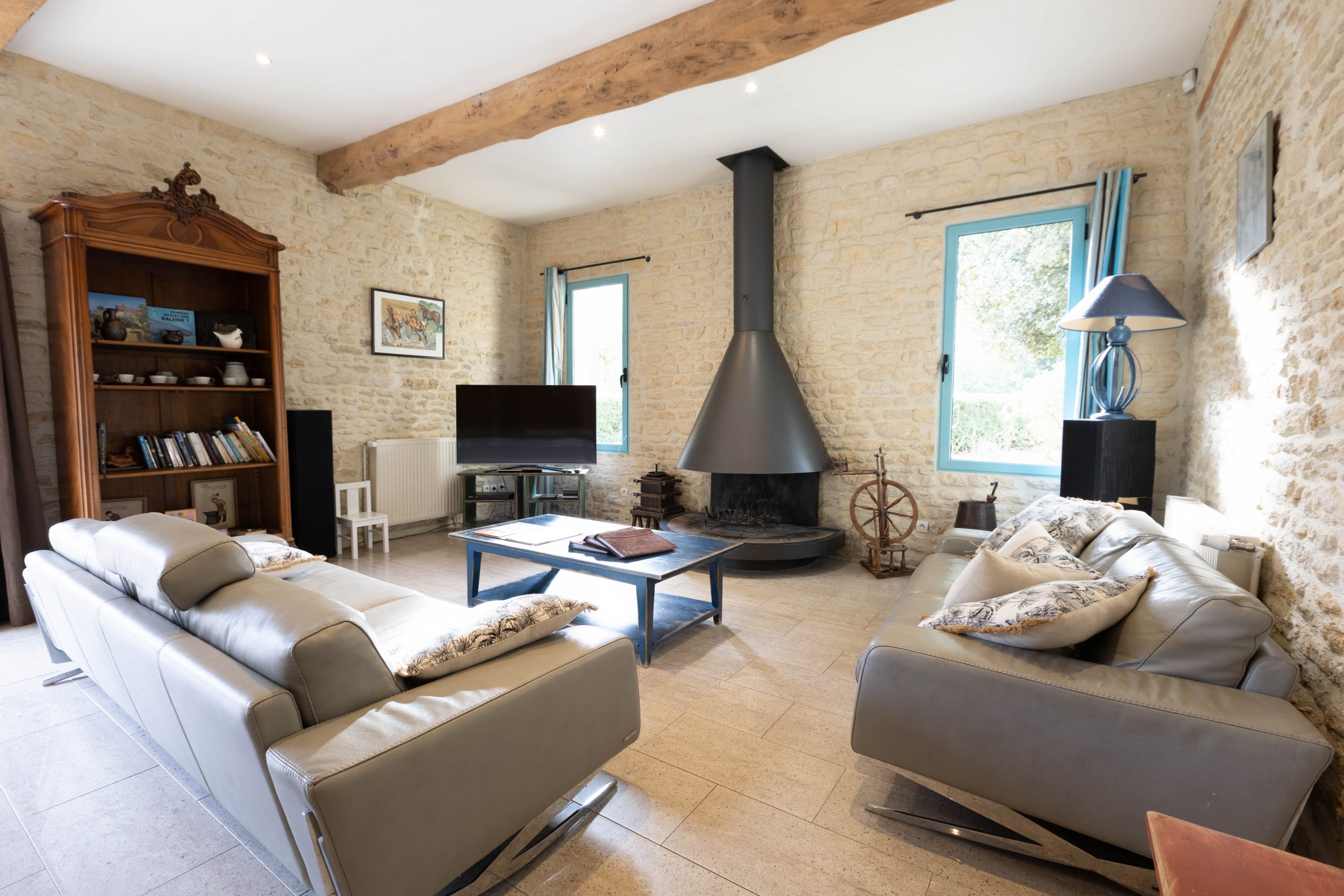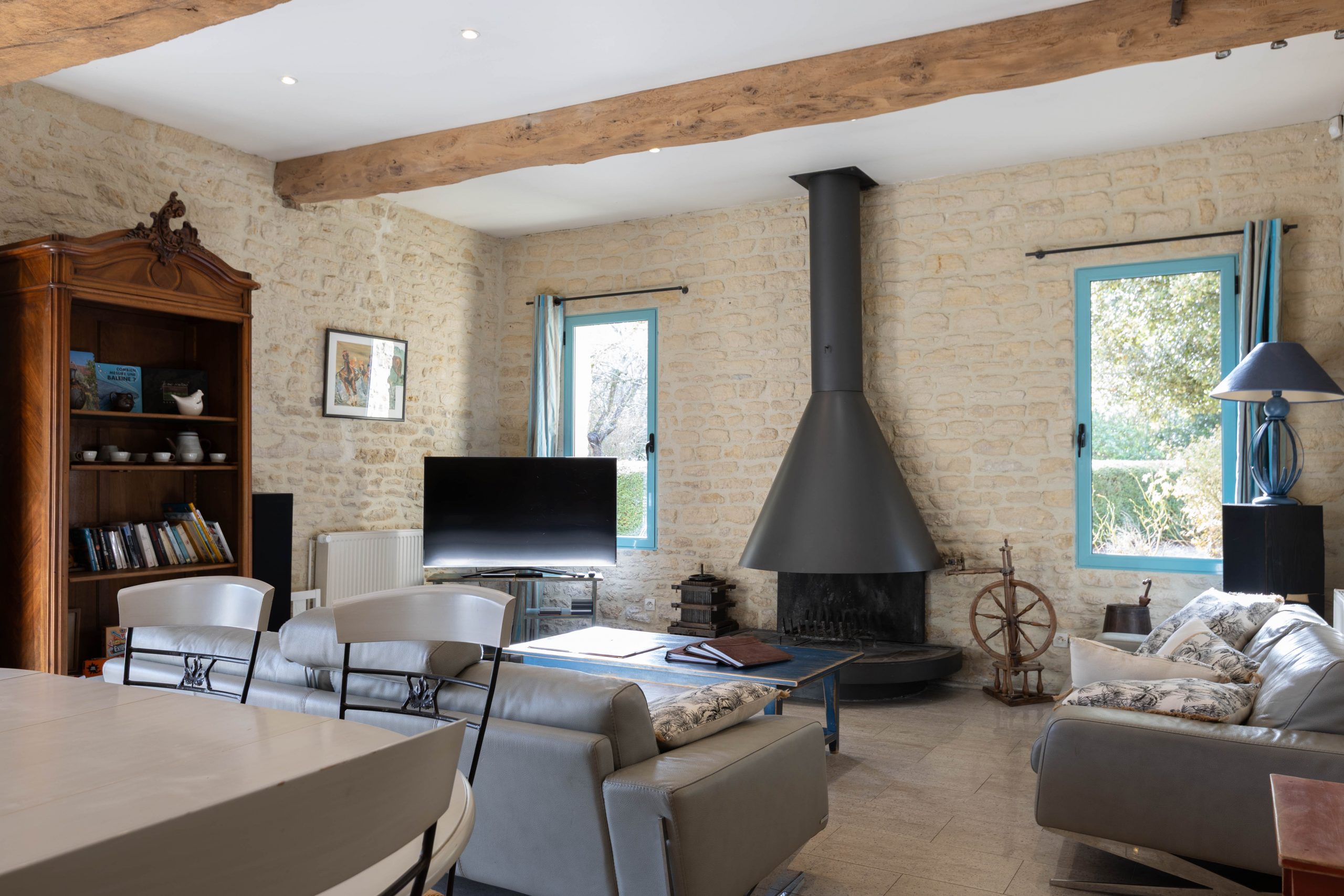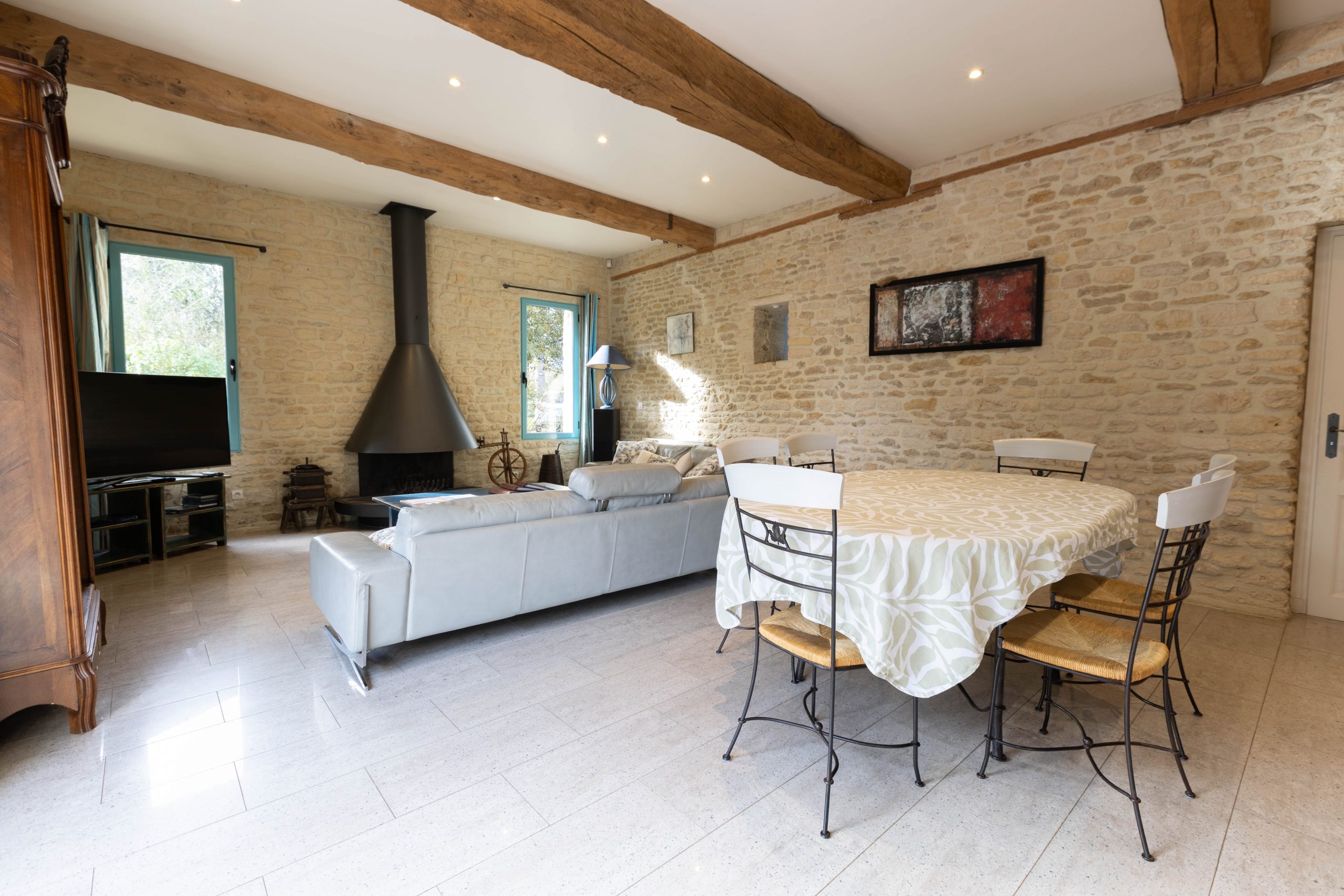 – Grande salle manger, salon avec cheminée et Smart TV 140 cm. La cheminée du salon est fonctionnelle de la Toussaint à Pâques.