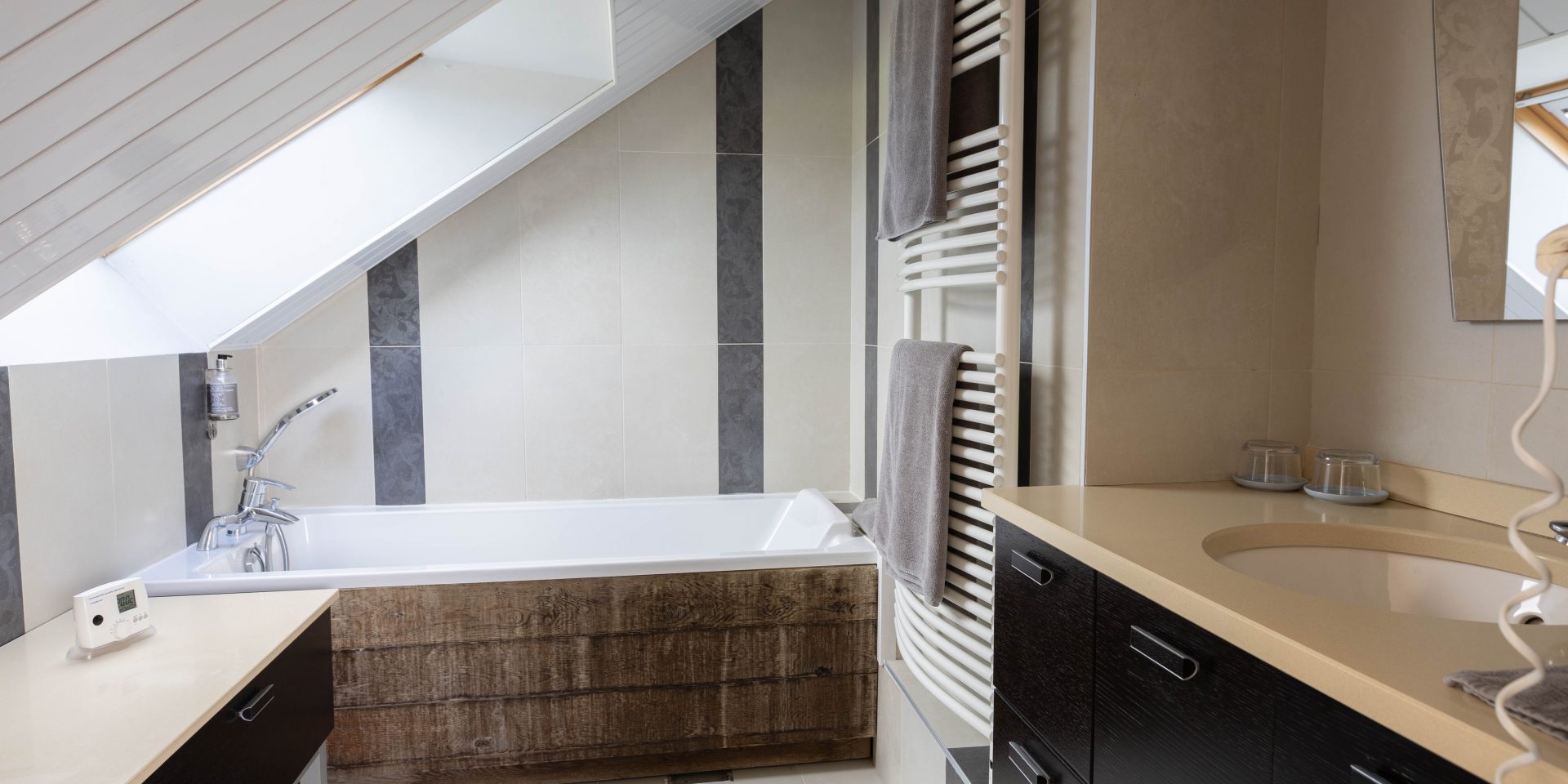 À l’étage, profitez d’une grande chambre avec TV et d’une salle de Bain ouverte avec baignoire. La cheminée de la chambre est uniquement décorative.